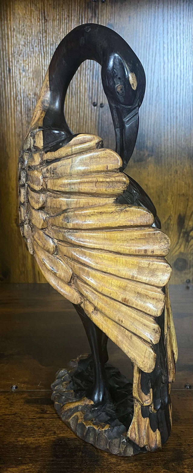 This expertly hand-carved sculpture captures a bird in a moment of distress as it plucks feathers from its back. The intricate detailing highlights the delicate textures of the feathers and the bird’s expressive posture, showcasing skilled craftsmanship. Ideal for collectors and art enthusiasts, this piece offers a unique blend of natural realism and emotional depth, making it a compelling addition to any collection or display.