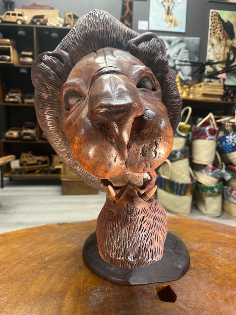 Dark Red / Brown Wooden Hand Carved Lions - Stunning Facial Features and Realism