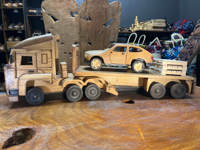 Expertly hand carved in Malawi, this wooden truck and trailer model is a masterpiece of craftsmanship. With intricate details such as exhaust and trailer design, this set includes three pieces: the truck head, trailer, and car. The Car Resembles a Golf GTI Mark 2 and the truck a Scania Truck head. A must-have for any collector or lover of unique, expertly made items.