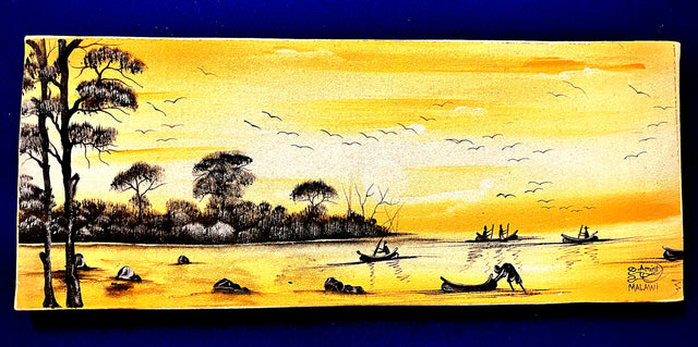 Setting: A golden-hued painting showing fishermen on canoes, silhouetted against the rising sun. The calm waters and distant trees create a serene African sunrise Moment.