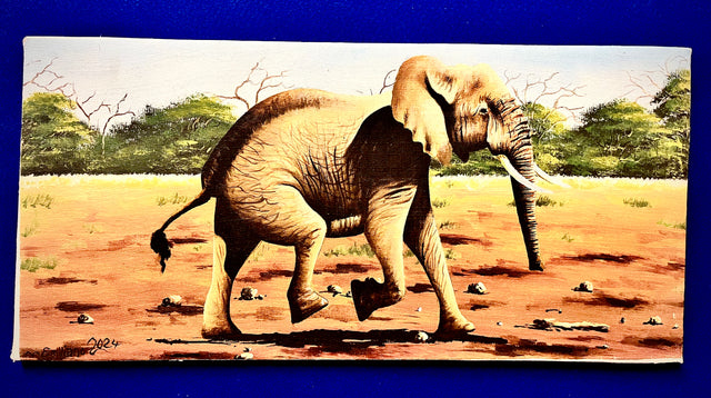Setting: This powerful portrayal of an elephant in motion embodies grace and strength. Every wrinkle in its skin tells a story of resilience, and its raised foot suggests a journey through a land it knows well. The soft hues of the background contrast with the deep shadows, highlighting the gentle dominance of this magnificent animal in its natural habitat.