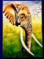 Setting: This stunning portrait captures the soulful gaze of an elephant, its weathered skin etched with time and wisdom. The rich, golden hues blend into lush green, evoking the warmth of the African savanna. Majestic tusks extend with quiet power, a symbol of resilience and strength. Delicate branches frame the scene, adding a sense of depth and life. This piece is a tribute to the grace and dignity of one of nature’s most revered creatures.