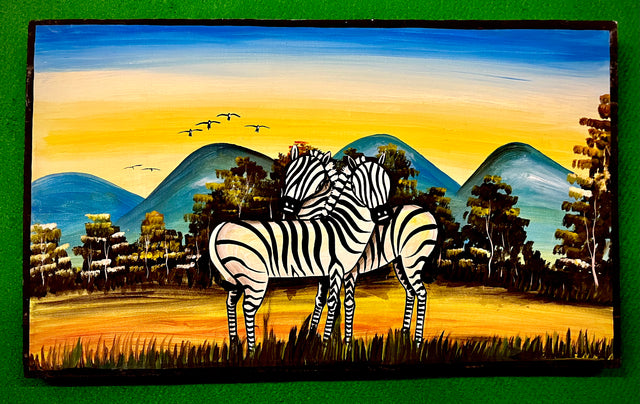 Setting: Two zebras nuzzle in the golden glow of an African savannah, framed by rolling hills and birds in flight. A heart warming scene that symbolizes companionship and the untamed beauty of the wild.