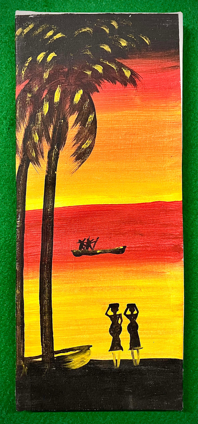 This vivid painting captures the serenity of an African sunset, where the sky is ablaze with hues of deep red, orange, and yellow. Silhouetted against this breathtaking backdrop, two women carry goods on their heads while a fisherman rows his canoe across the calm waters. Towering palm trees frame the scene, adding to the sense of tranquility and timelessness.