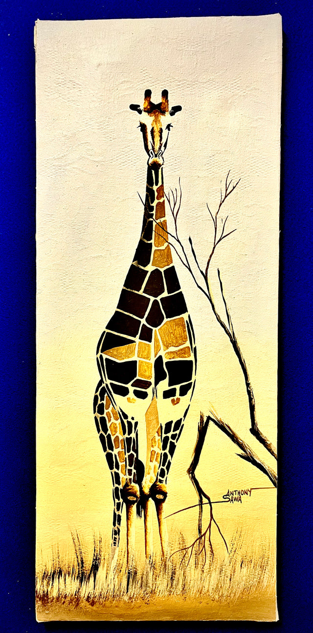 Setting: A giraffe stands tall in the golden grasslands, its elongated form blending seamlessly with the earthy background. The artist uses soft, blended tones to create a peaceful atmosphere, while the giraffe’s distinctive markings and expressive eyes add character. A simple yet elegant tribute to one of Africa’s most iconic animals.