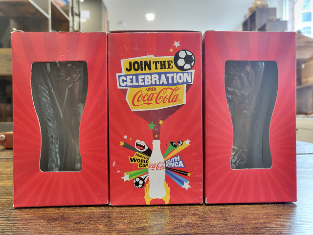 Authentic 2010 Coca Cola World Cup South Africa commemorative glasses, sold individually. Each glass is brand new, preserved in its original packaging, making these rare collectibles a must-have for sports memorabilia enthusiasts. Never used and in mint condition, these limited edition glasses represent a significant moment in football history.