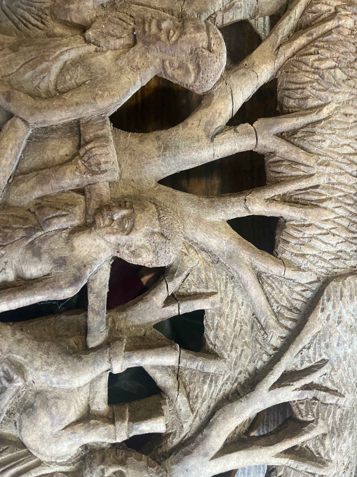 This antique African Village Scene Plaque, dating back at least 60 years, features a charming village scene and measures 65x31cm. Despite some slight cracks, this original piece has been preserved in its authentic state, making it a unique and beautiful addition to any feature wall.