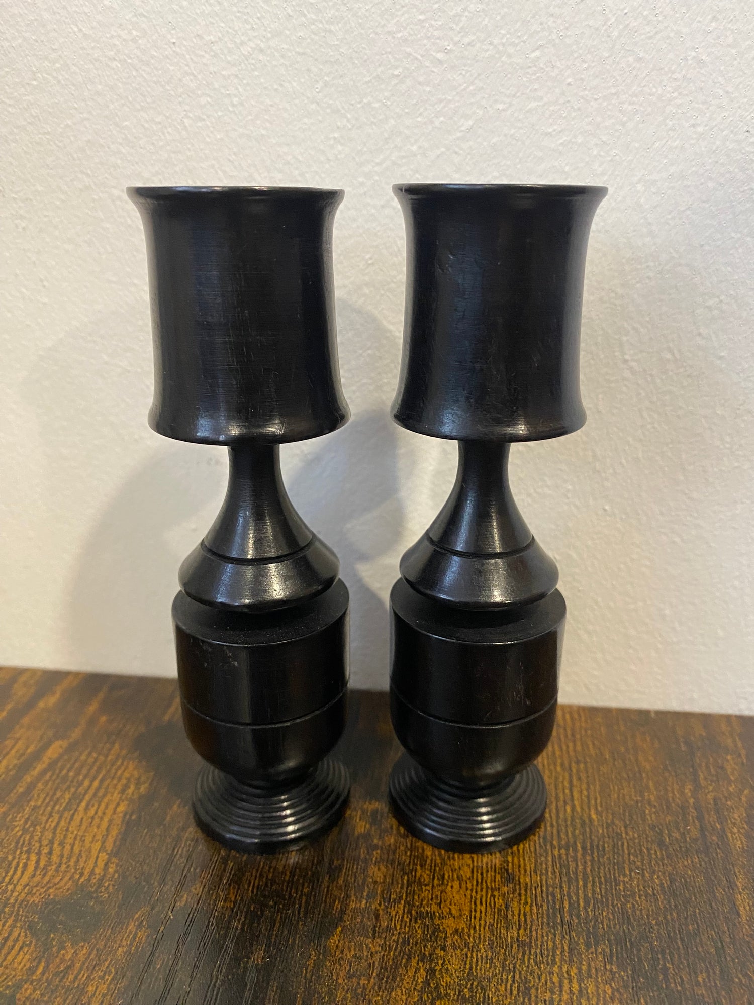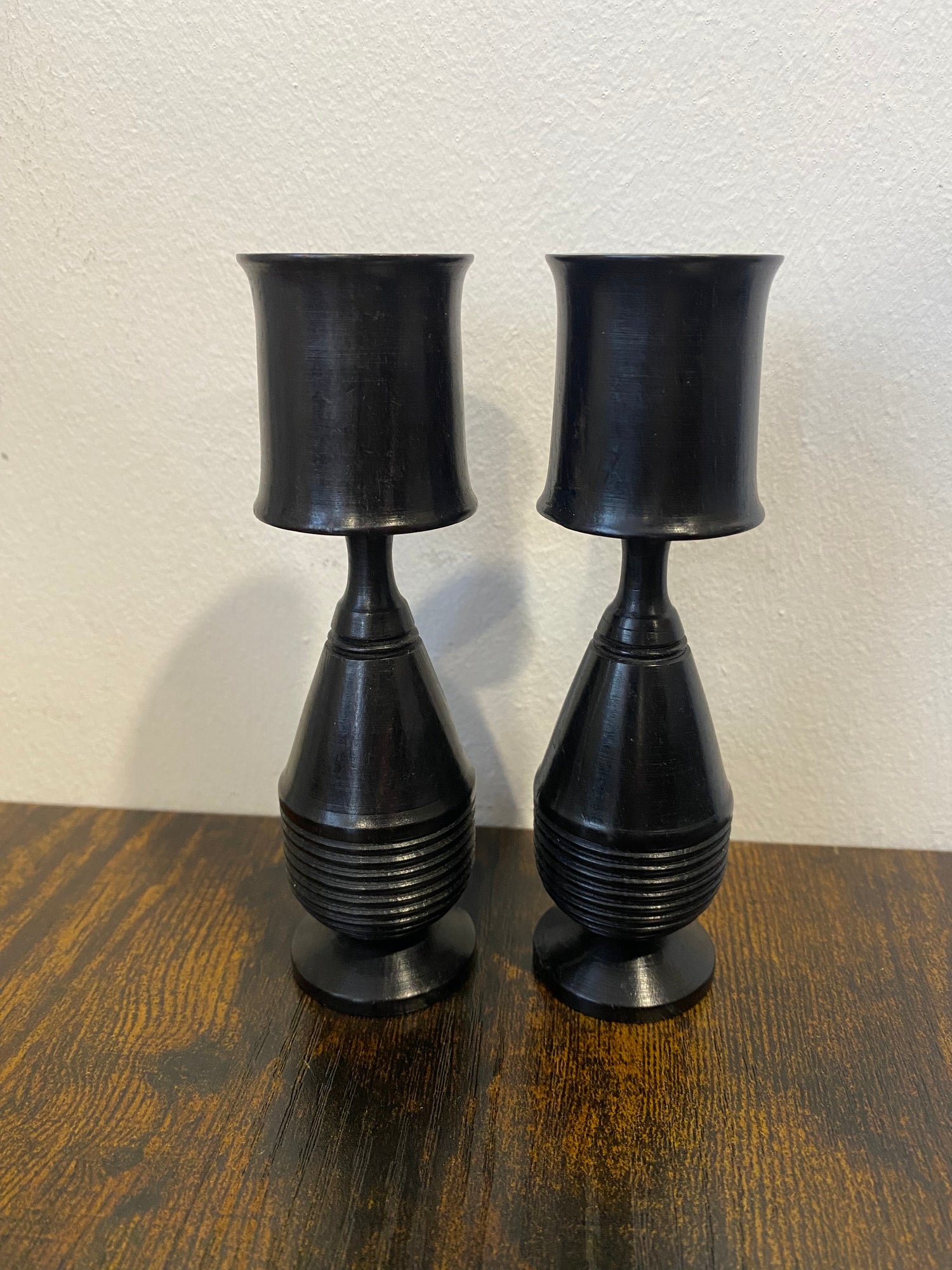 Elevate your home with this stunning pair of handcrafted ebony candle holders, authentically made in Kenya. Each holder stands 12cm tall with a 2.5cm diameter base, perfectly proportioned to showcase your favourite candles. Carved from rich, dark ebony wood, these pieces celebrate traditional African craftsmanship and bring warmth and character to any room. A timeless addition to your décor that honours artisanal heritage.