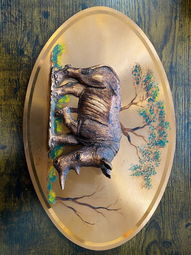 Behold this exceptional handcrafted copper artwork featuring a solitary rhino set against a backdrop of African trees. Each piece is meticulously created by talented artisans across Africa, embodying the essence of authentic Gastone vintage craftsmanship. The warm, lustrous copper surface captures light beautifully, revealing intricate details that tell a story of wildlife and natural beauty. At 40 x 26cm, this is a statement piece that transforms any room into a gallery of African heritage. Perfect for those who appreciate genuine artisanal work and the raw power of African artistic expression. A remarkable addition to any collection.