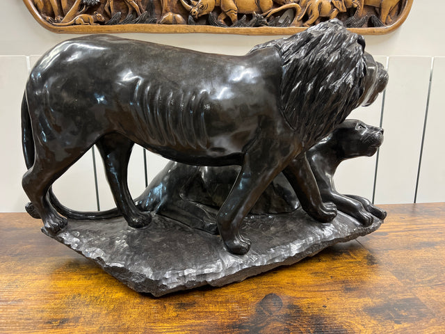 Hand made with great skill, lion and lioness posing in power. The Lionesses ear has been bitten off but the King still has his Queen by his side